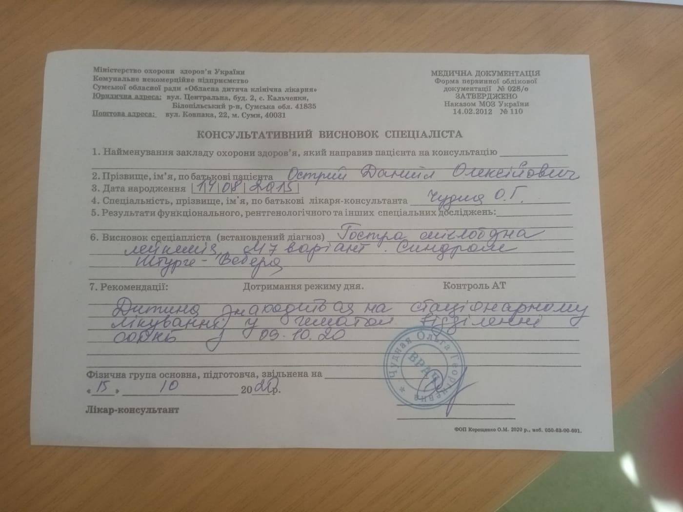 У вересні Данило почав хворіти на застуду, потім з’явилися болі в колінах. Батьки звернулися до травмпункту, так як думали, що дитина отримала травму, (хлопчик не розмовляє з причини первинного основного захворювання), їх направили до кардіолога з підозрою на артрит, а кардіолог – до гематолога з підозрою на васкуліт. Але здавши аналізи, Даню терміново госпіталізували в гематологічне відділення, зробили пункцію … Київ підтвердив лейкоз. Зараз Дані почали протокол лікування в Сумах, хлопчикові майже кожен день вливаються компоненти крові і почали хіміотерапію. Так само є підозра на рак очі, в головному мозку є кіста, робили МРТ, якщо діагноз підтвердиться, потрібно буде робити операцію. Зір на правому оці пропало повністю. Але зараз в першу чергу потрібно пролікувати лейкоз і стежити за динамікою, перевіряти який результат дає хімія на хворобу. Мама дуже хвилюється, щоб виходило знайти донорів на кров, так як Дане зараз капають компоненти крові дуже часто. Просимо допомоги для нашого маленького відважного Данька і підтримки в цій нелегкій ситуації.
