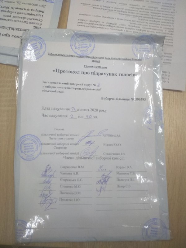 Спостерігачі ОПОРИ повідомляють, що на Верхньосироватській територіальній виборчій комісії Сумського району дата і час пакування на протоколах однієї з виборчих дільниць не відповідають дійсності. Члени ТВК голосуванням вирішили внести зміни в документацію ДВК одразу у себе на засіданні.