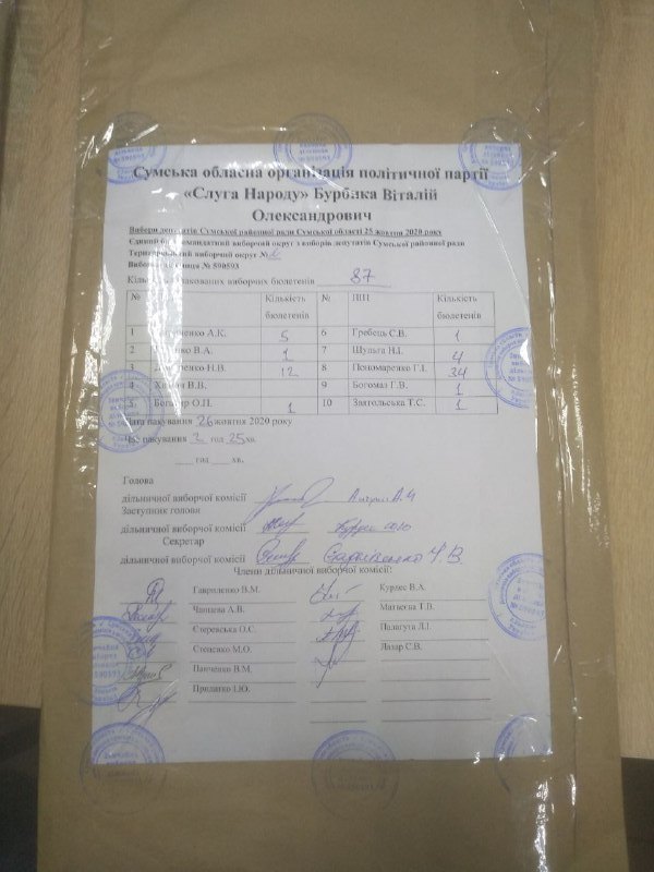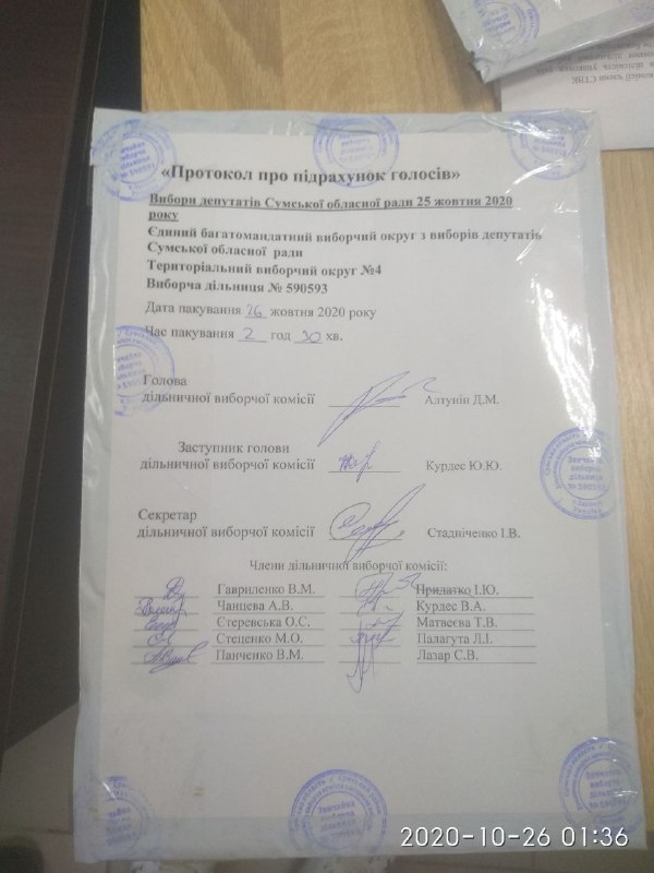 Спостерігачі ОПОРИ виявили, що на протоколах підрахунку голосів, які надійшли від дільничної виборчої комісії № 590593 (дільниця знаходиться за адресою вул. Галкіна, 21Б, с. Залізняк Сумського району) позначений час не збігається із фактичним. Зокрема, на протоколах було позначено час пакування від 01:30 до 02:30, хоча фактично протоколи надійшли з дільниці раніше за 01:30.