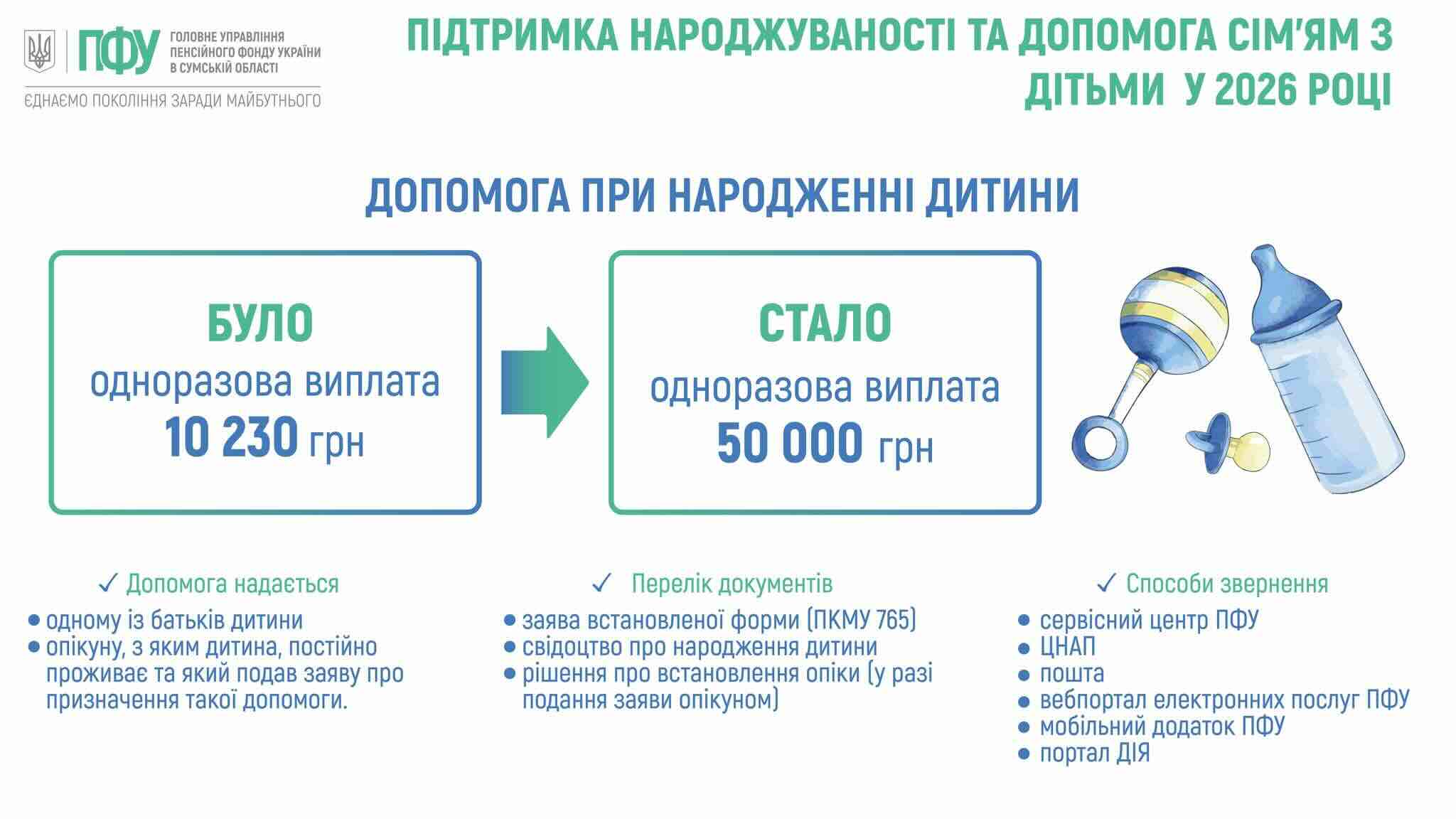 Попри виклики воєнного часу, підтримка материнства та дитинства на Сумщині виходить на якісно новий рівень. З 1 січня 2026 року Головне управління Пенсійного фонду України в Сумській області проводить оновлену систему виплат, яка покликана стати реальним фінансовим фундаментом для молодих батьків. Замість складних розрахунків та символічних сум — суттєва допомога, доступна в кілька кліків.