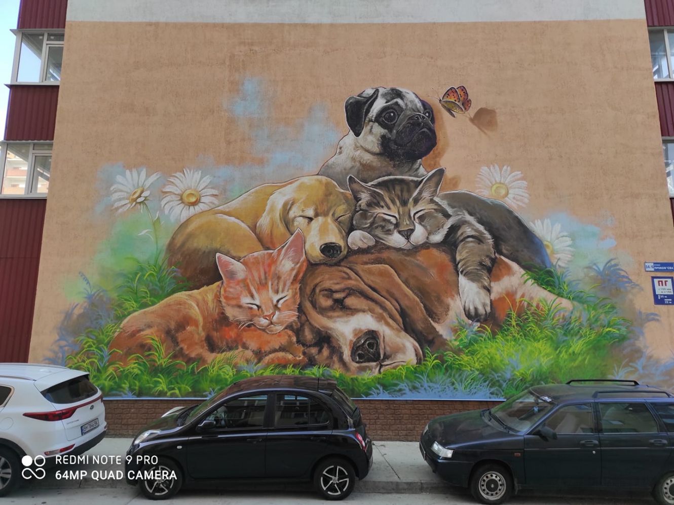 У Сумах на стіні багатоповерхівки на вулиці Прокоф’єва намалювали новий мурал. На ньому зобразили трьох собак і двох котів, які відпочивають разом у траві серед ромашок. Над створенням зворушливої картини працював художник Єгор Авдєєнко, відомий іншими цікавими муралами в Сумах.