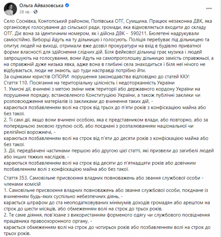 «Виборці йдуть на ту дільницю і голосують. Поліція перебуває під дільницею та опитує людей на виході, отримали вже дозвіл прокуратури на вхід в будівлю приватної форми власності для здійснення слідчих дій. Біля фейкової дільниці грає музика і людей запрошують на голосування, вони йдуть на самопроголошену дільницю замість справжньої, а на справжній дуже низька явка, адже вона в глибині села знаходиться і біля неї нічого не відбувається, люди не знають, що туди насправді потрібно йти», – розповіла Айвазовська.