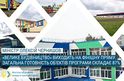 За даними моніторингових груп Мінрегіону, які постійно відслідковують динаміку реалізації програми на місцях, станом на 21 жовтня середній відсоток будівельної готовності об’єктів по Україні складає 87%. Дитсадки, що входять до переліку «Великого будівництва», готові на 87%, школи на 92%, спортивна інфраструктура на 83%, інші об’єкти готові на 86%.