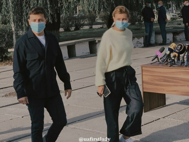 На цей раз дружина глави держави вдягла більш комфортний одяг: яскравий жовтий светр oversize, чорні штани з кишенями і білі кросівки. Волосся Олена підв’язала хусткою, довершивши образ темними сонцезахисними окулярами.